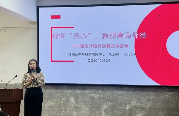 区教育科学研究中心书记周满意以《常怀“三心” 涵养高尚师德——新时代教师的责任与使命》为题,结合教育实践中的鲜活案例,深入阐释“三心”内涵,强调新时代教师要以“三心”为镜,厚植教育情怀,筑牢师德根基。现场教师纷纷表示将以此为导向,在日常教学中践行师德规范,争做学生为学、为事、为人的大先生。