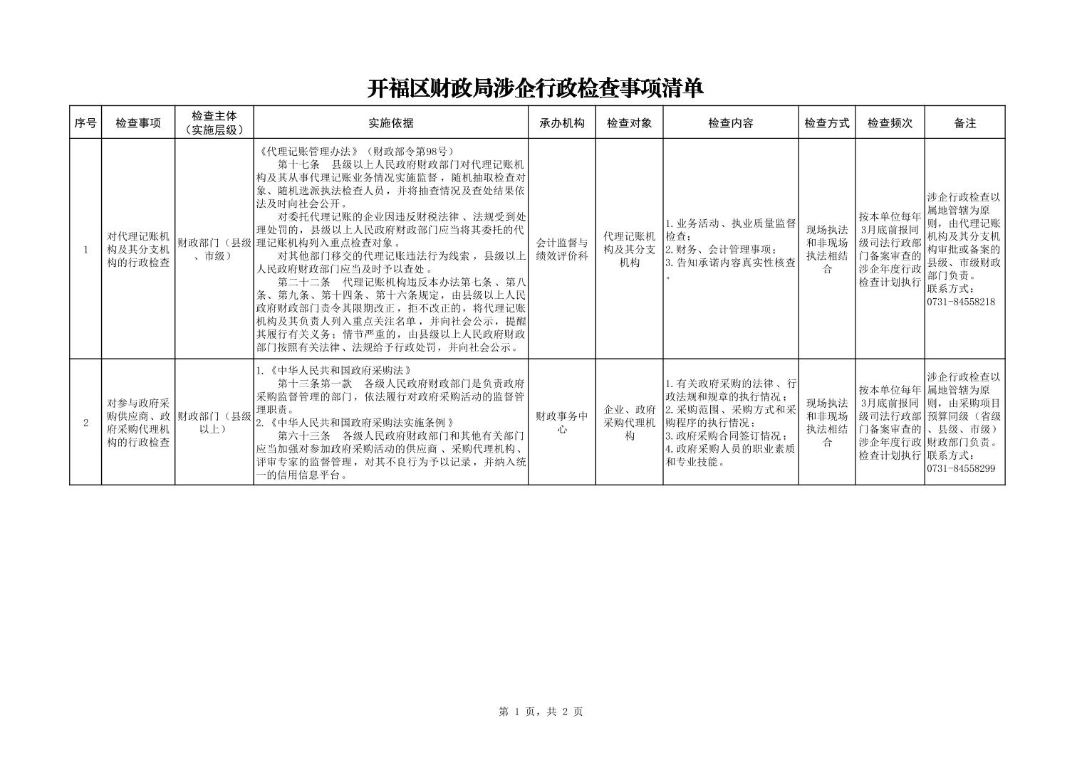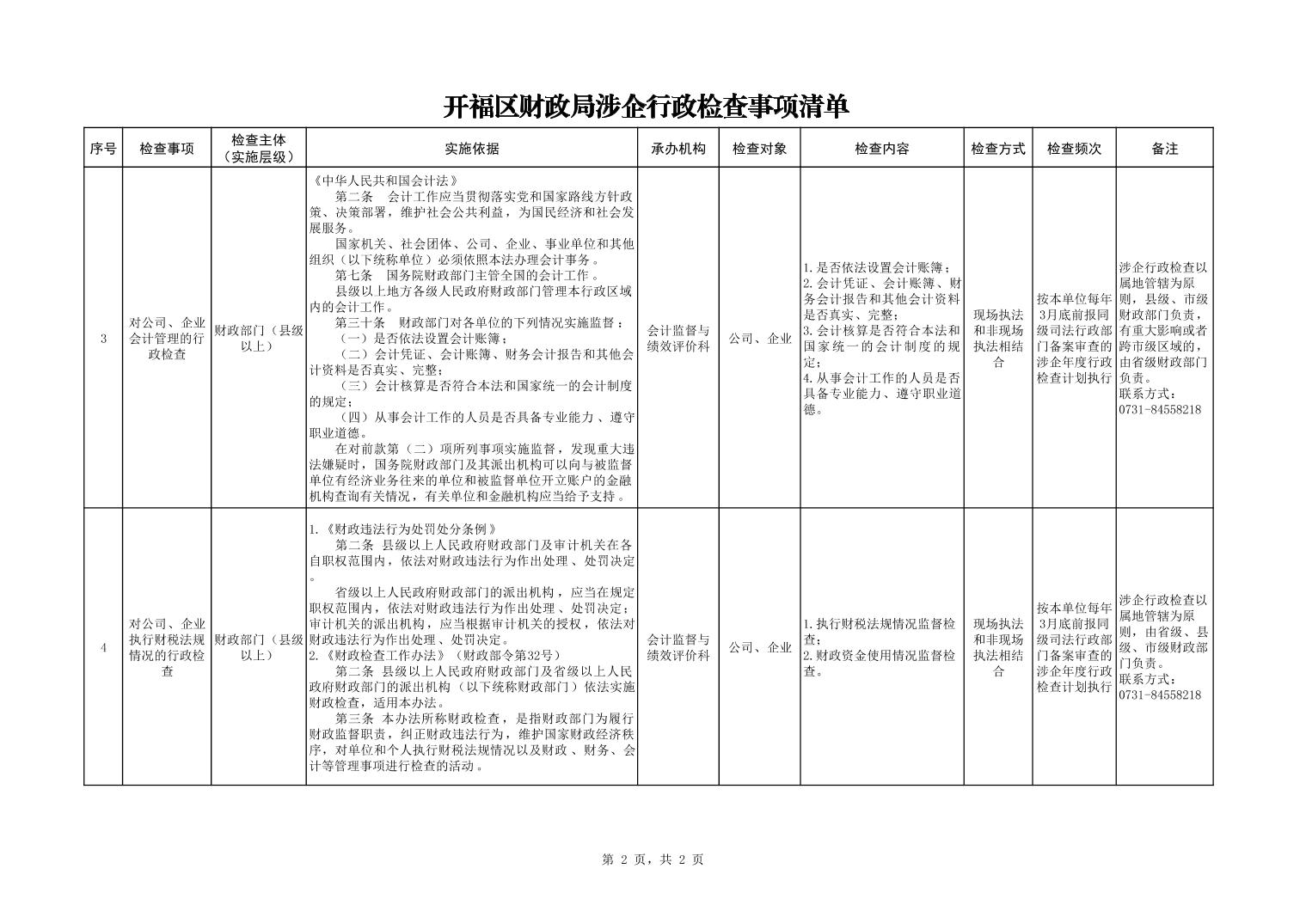 开福区财政局涉企行政检查事项清单