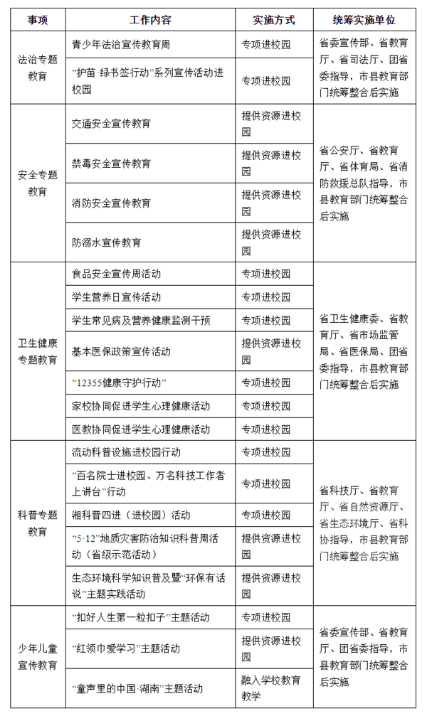1.专项进校园。经教育行政部门统筹安排,牵头单位制定活动方案,组织相关人员和教育资源,有序进入中小学校开展活动。