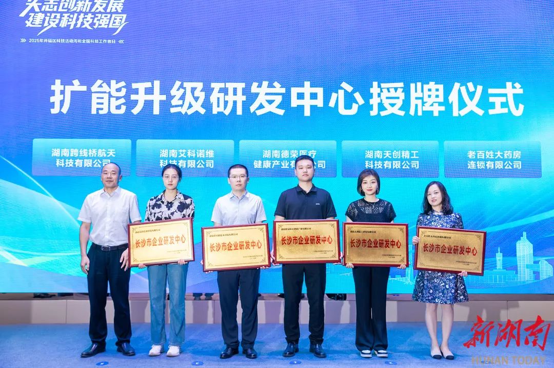 授牌仪式上,长沙市科技局党组成员、副局长罗强为湖南跨线桥航天科技有限公司、湖南艾科诺维科技有限公司、湖南德荣医疗健康产业有限公司、湖南天创精工科技有限公司及老百姓大药房连锁有限公司5家获评“长沙市扩能升级企业研发中心”的企业授牌,此举旨在鼓励企业加大研发投入,提升自主创新能力,推动科技成果转化。